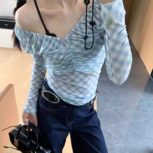 Blue Plaid One-Shoulder Mesh Long Sleeve T-Shirt for Women β Slim Fit Off-Shoulder Top