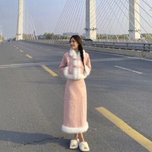 Suede Fur Collar Quilted Jacket and Skirt Set