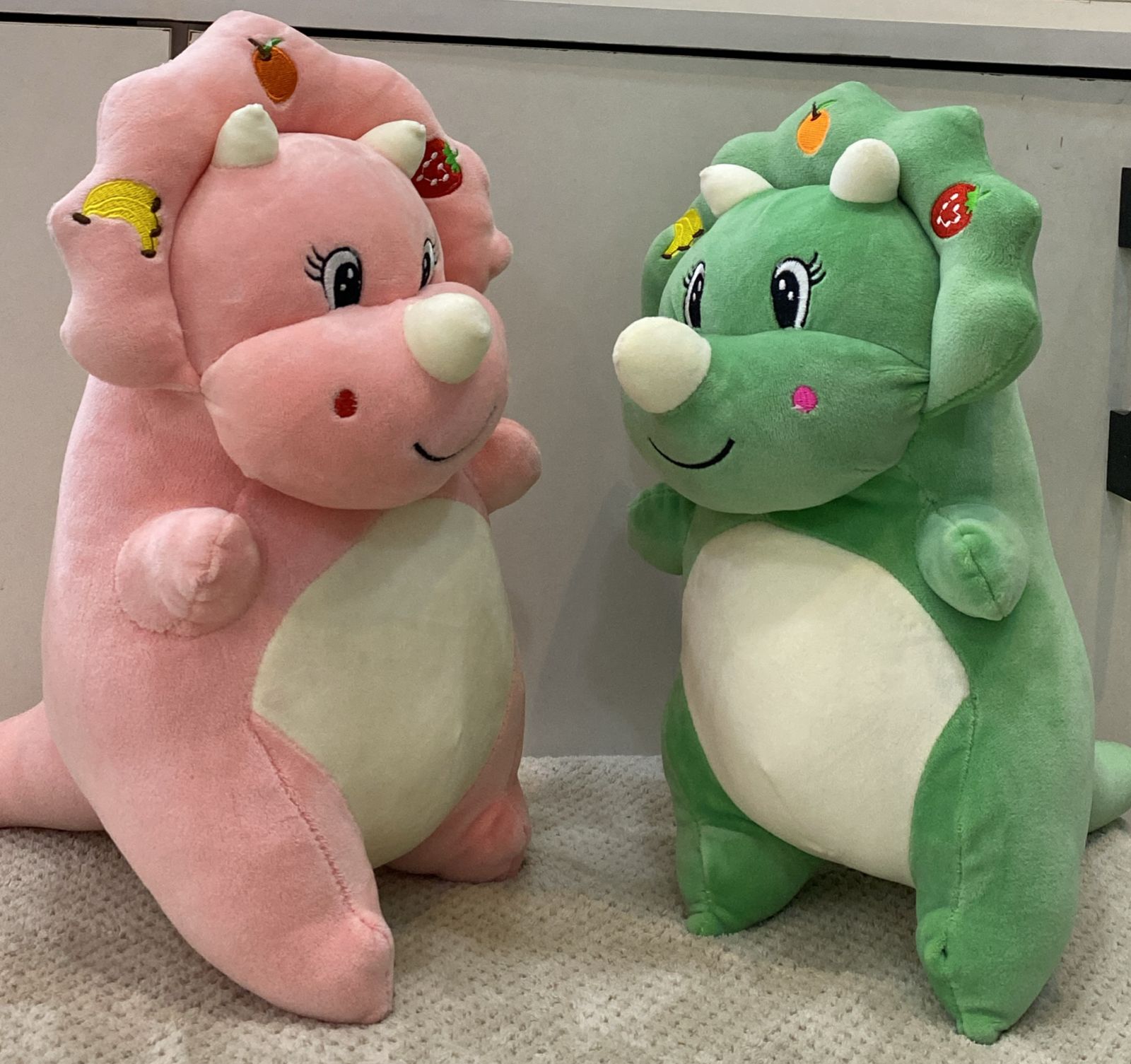 - Adorable and soft triceratops dinosaur plush toy available in vibrant green and pink colors.
