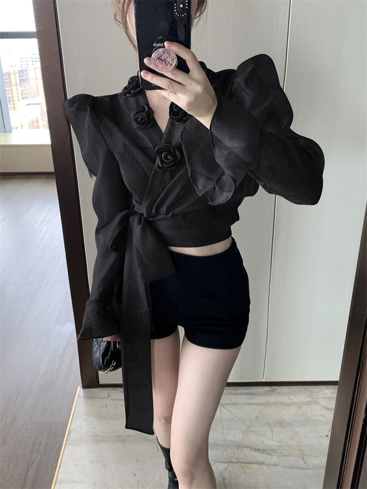 Elegant 3D Floral Blouse – French Tie-Waist Sheer Wrap Shirt