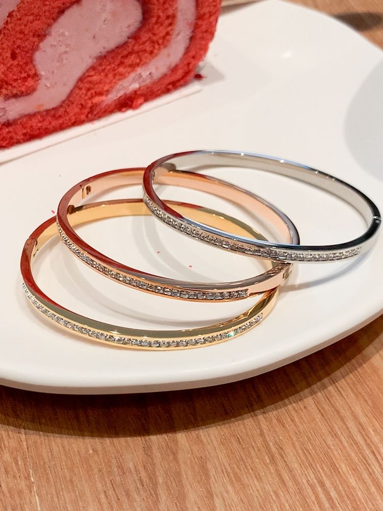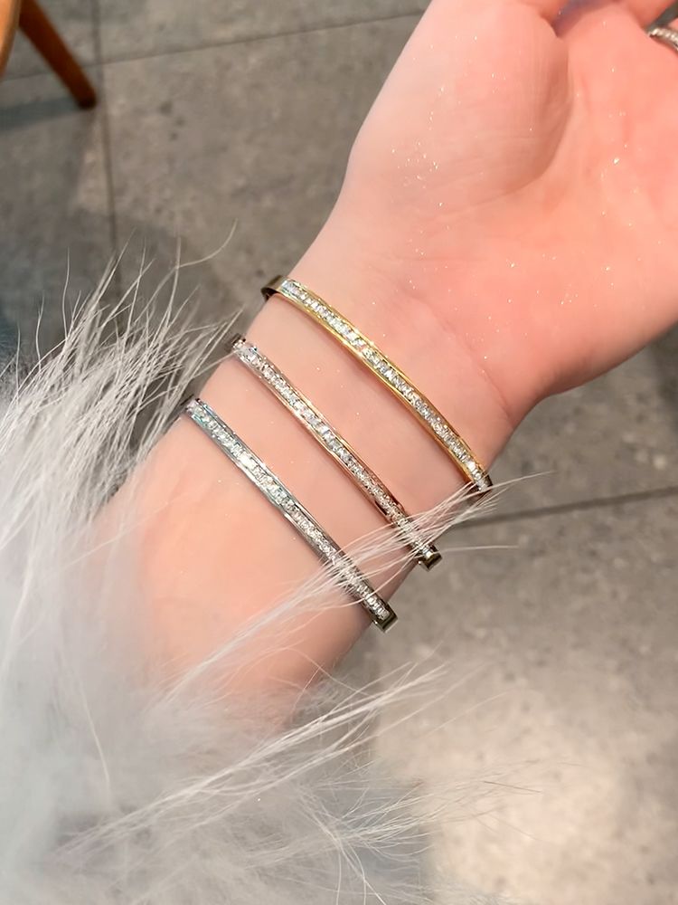 This full crystal titanium steel bangle is designed with densely set shimmering stones that create a refined, radiant effect on the wrist. The clean bangle silhouette highlights the sparkle without feeling heavy, delivering a balanced look of elegance and confidence. Made from titanium steel, it offers lasting shine, durability, and comfortable daily wear. Worn alone or layered with other bracelets, it adds a luminous finishing touch to both casual and dressier outfits.