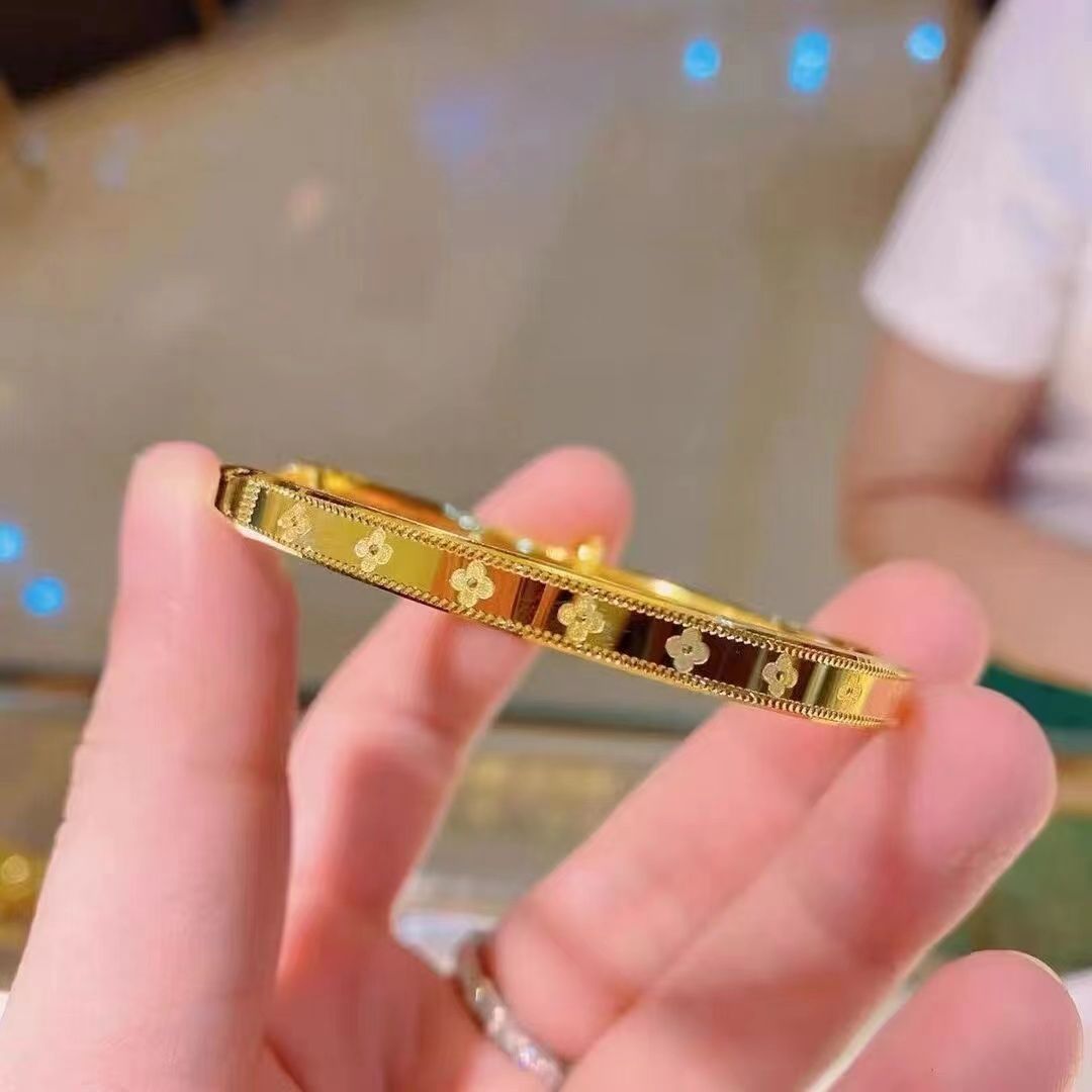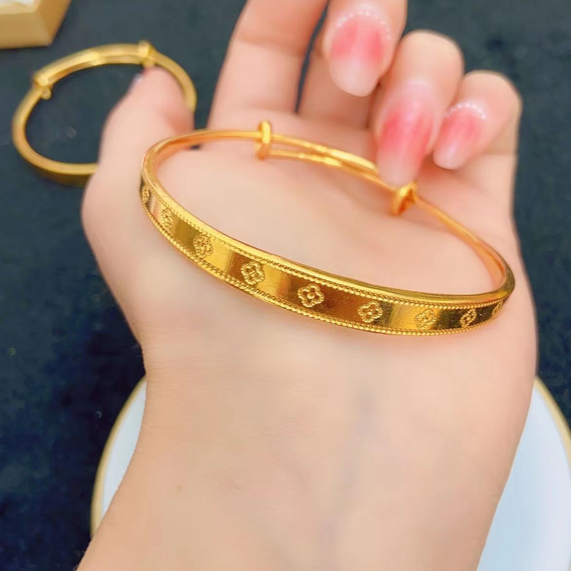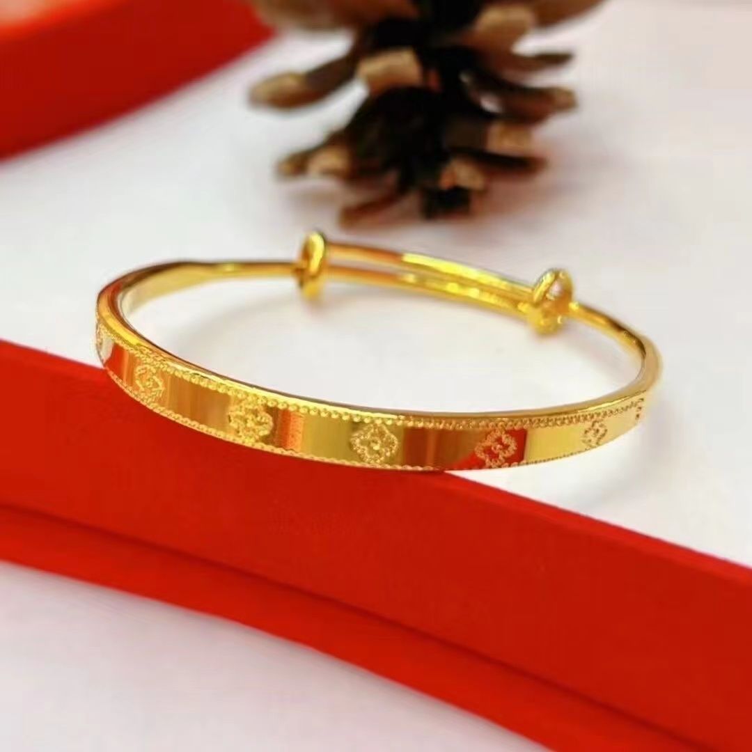 This minimalist gold-tone bangle features a refined clover motif with a smooth polished finish. Designed for everyday elegance, it offers a lightweight feel and comfortable fit. The delicate pattern adds subtle charm, making it suitable for solo wear or stacking with other bracelets. A versatile accessory for daily styling or thoughtful gifting.