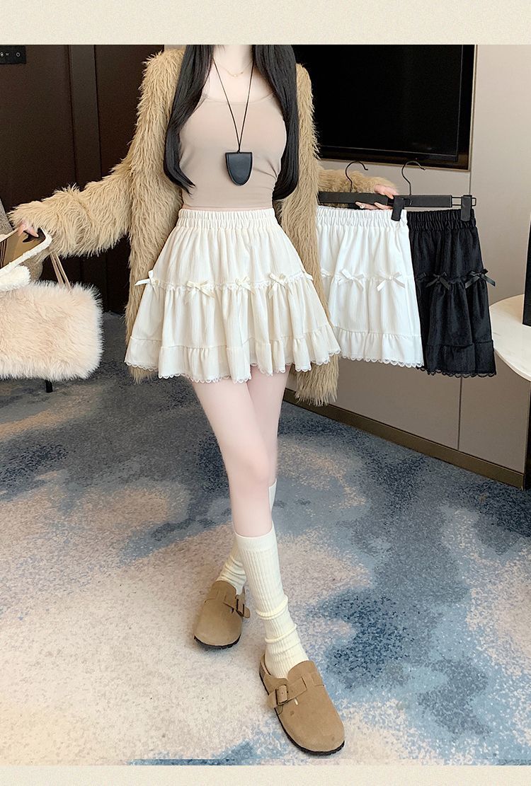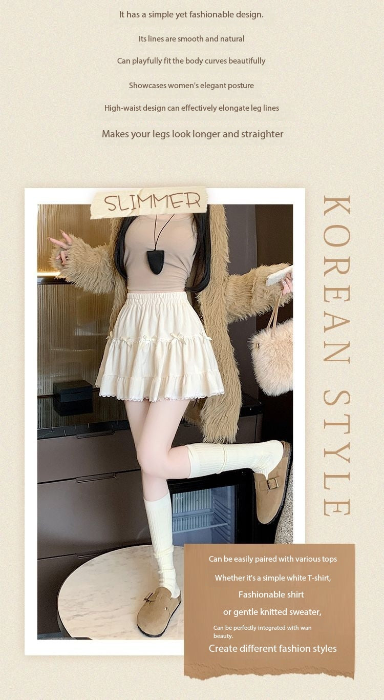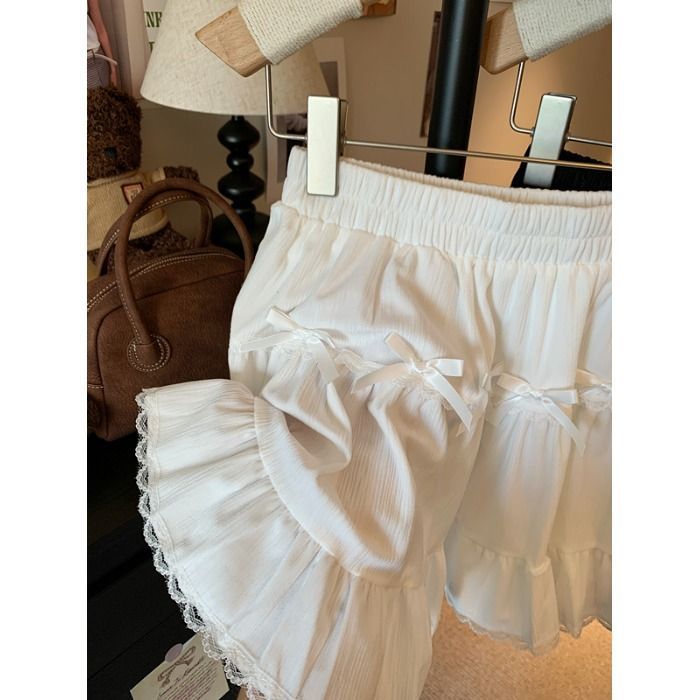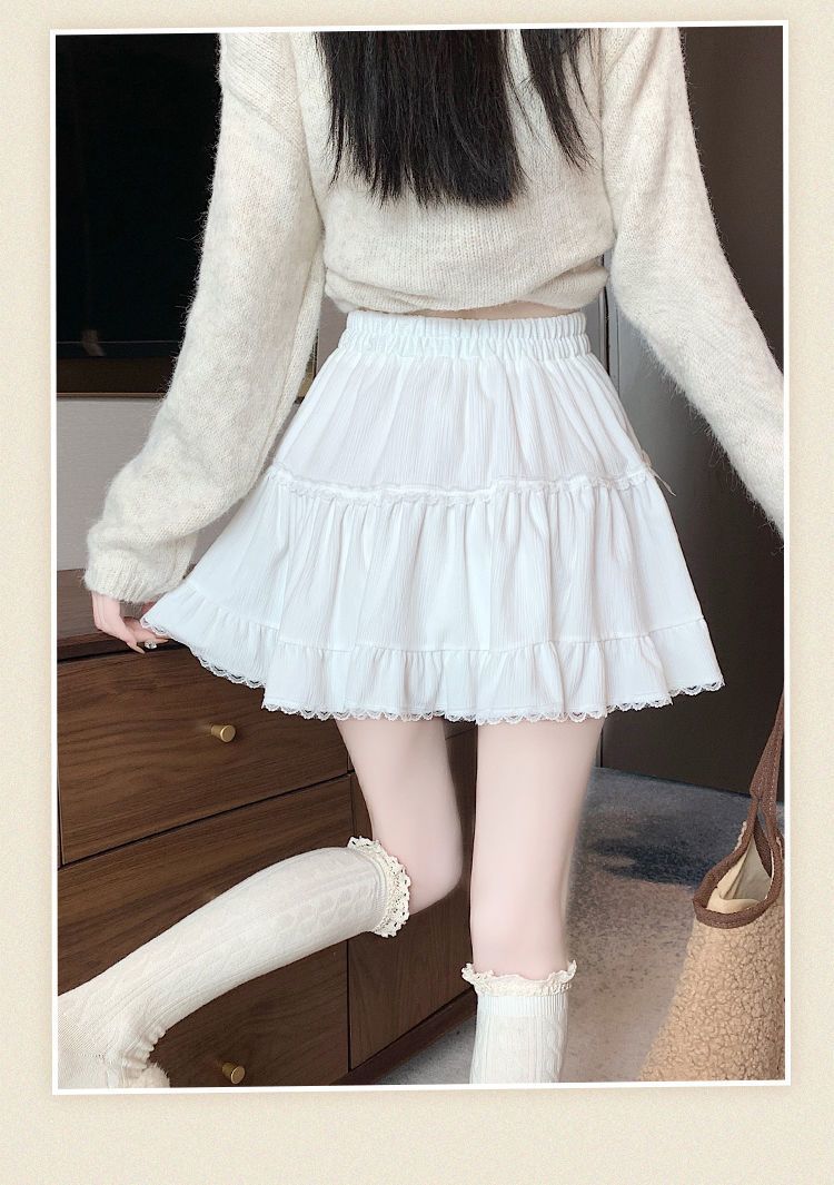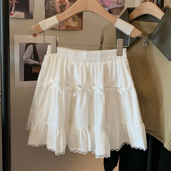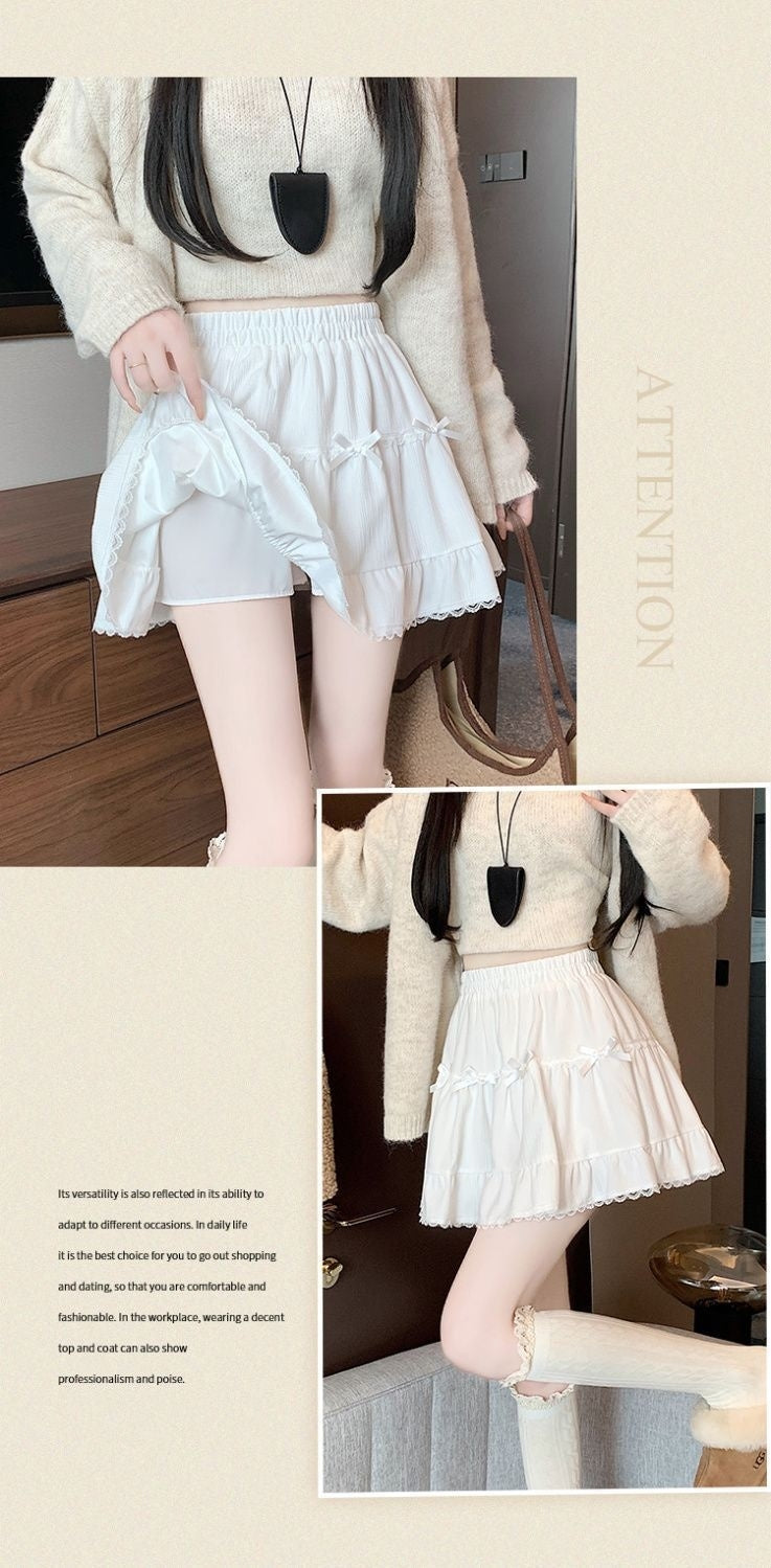 This high-waist mini skirt features a charming bow detail paired with delicate lace ruffle edges for a soft, romantic look. The tiered cake-style silhouette creates a light puffy shape that enhances volume while maintaining a flattering waistline. Designed to sit comfortably at the waist, it highlights the legs and adds a playful yet refined touch to any outfit. Easy to style with fitted tops, blouses, or knitwear, this skirt brings elegance and sweetness to everyday wear and special occasions alike.