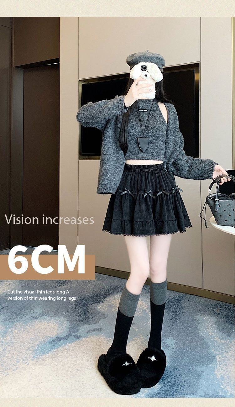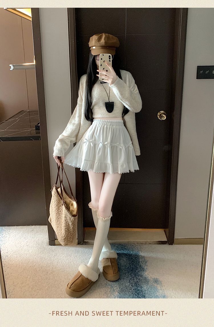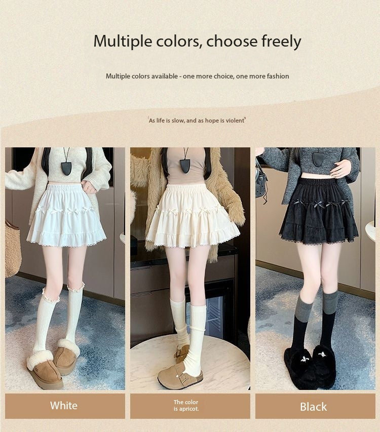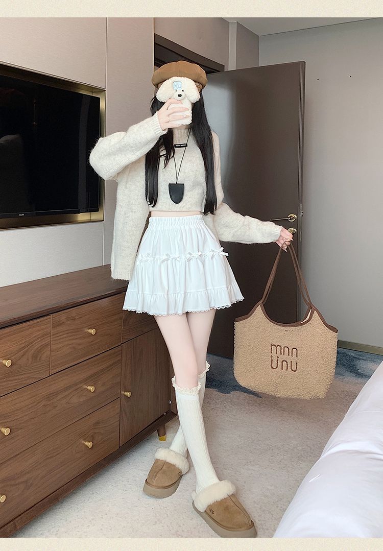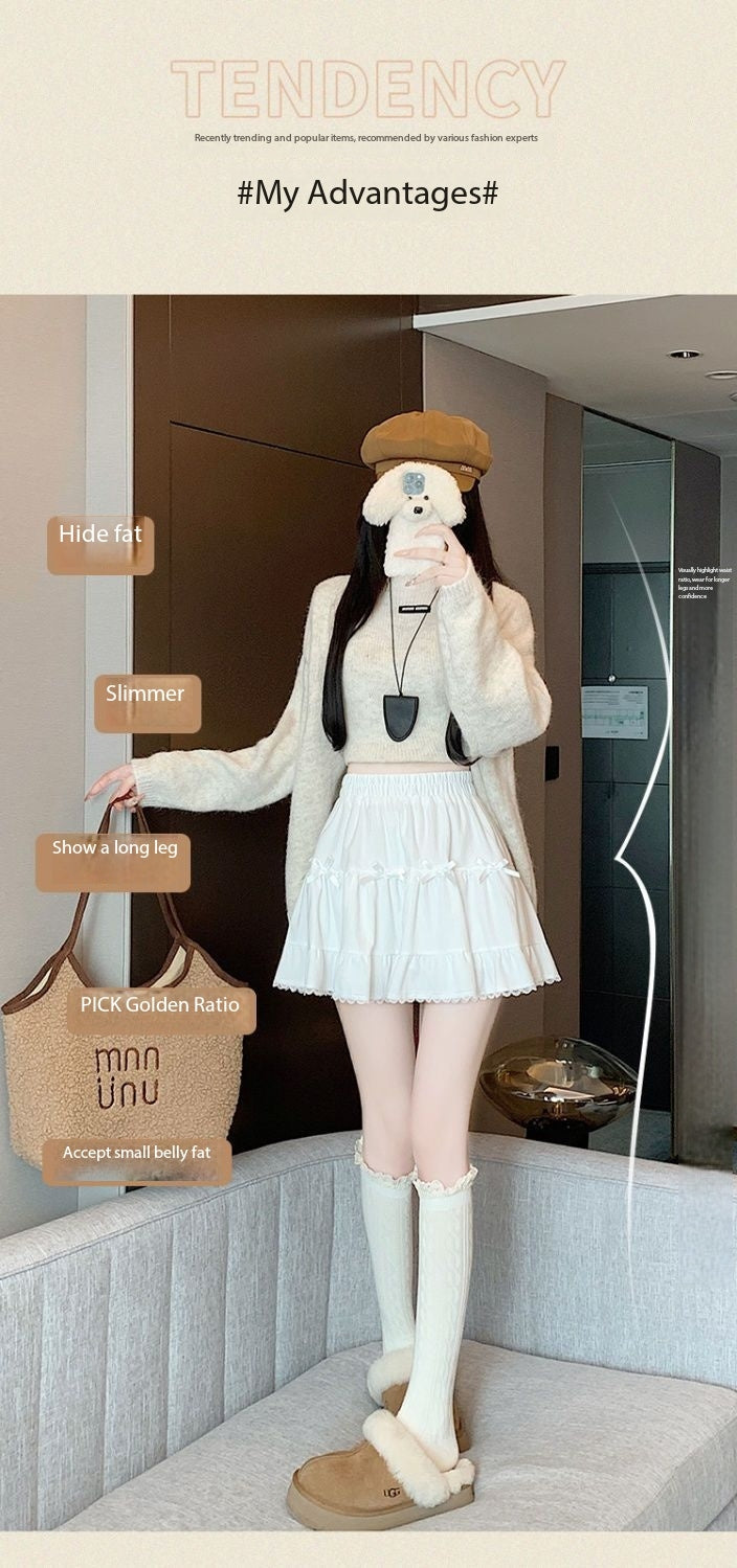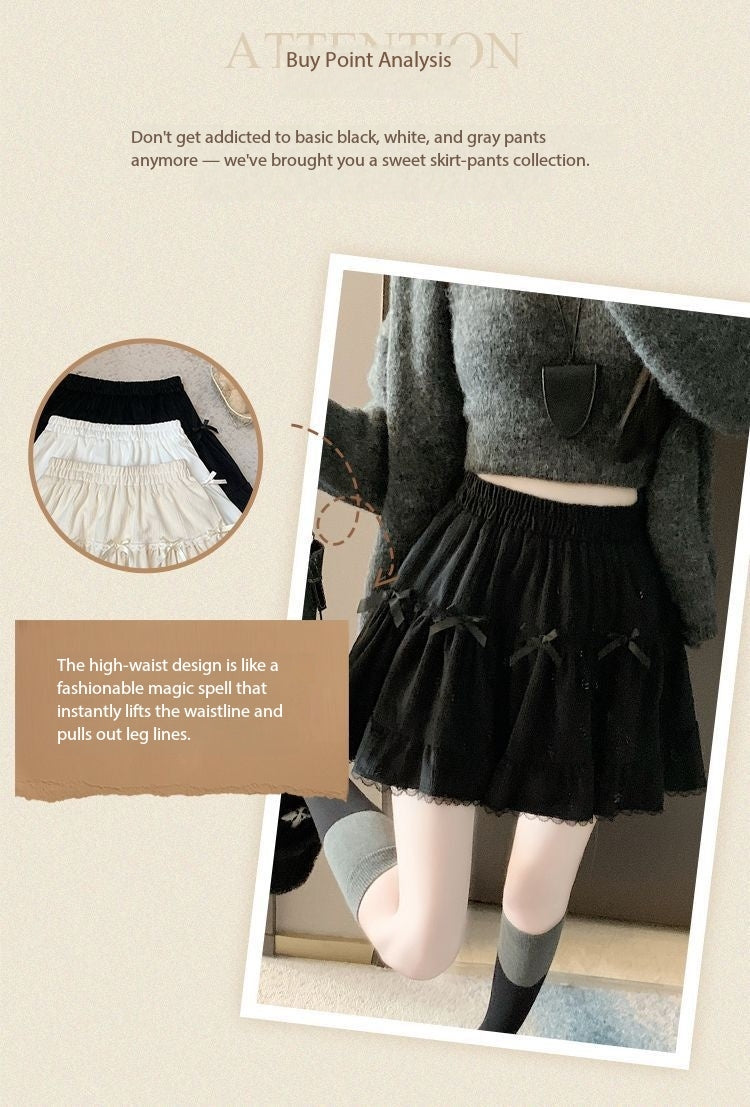 This high-waist mini skirt features a charming bow detail paired with delicate lace ruffle edges for a soft, romantic look. The tiered cake-style silhouette creates a light puffy shape that enhances volume while maintaining a flattering waistline. Designed to sit comfortably at the waist, it highlights the legs and adds a playful yet refined touch to any outfit. Easy to style with fitted tops, blouses, or knitwear, this skirt brings elegance and sweetness to everyday wear and special occasions alike.