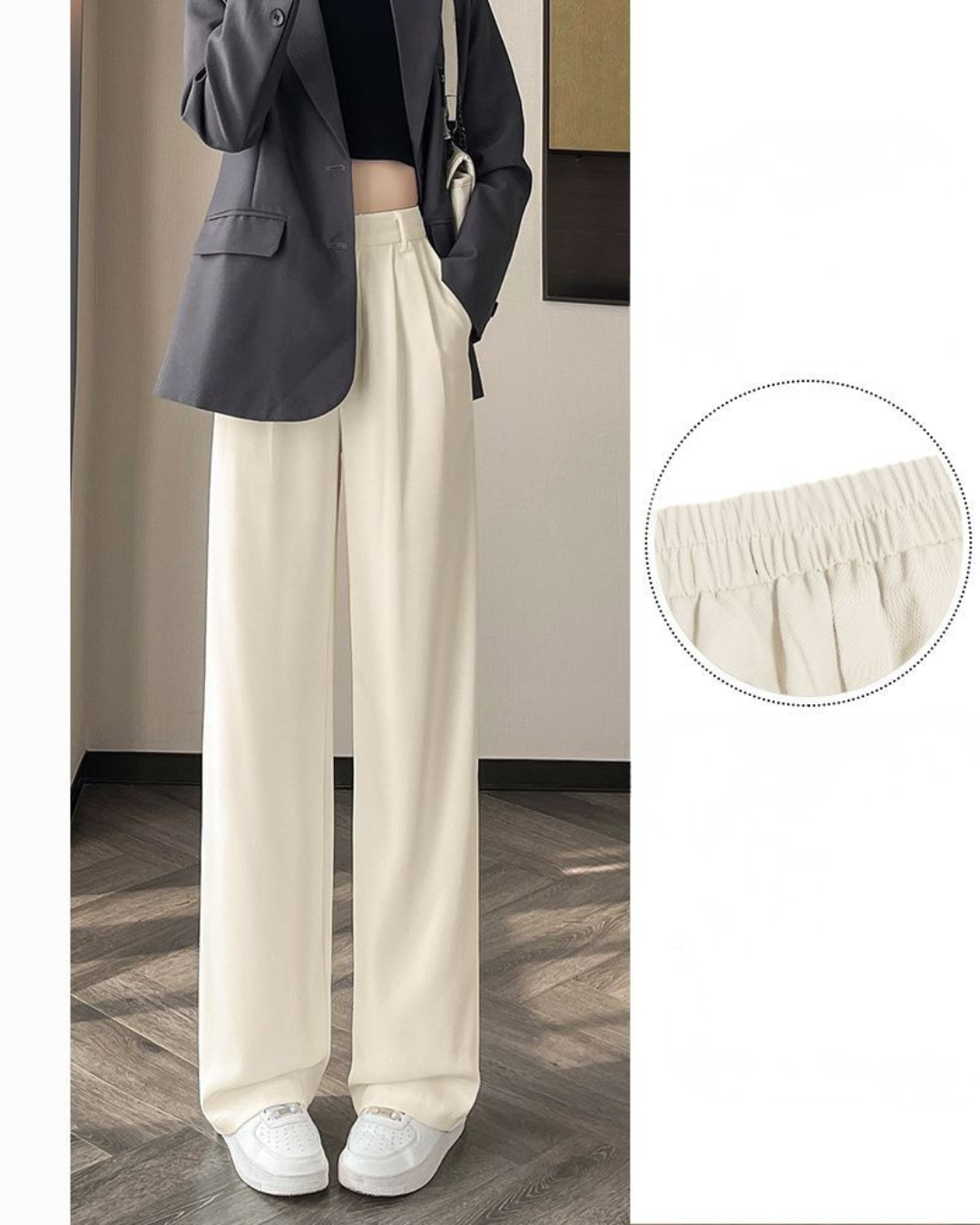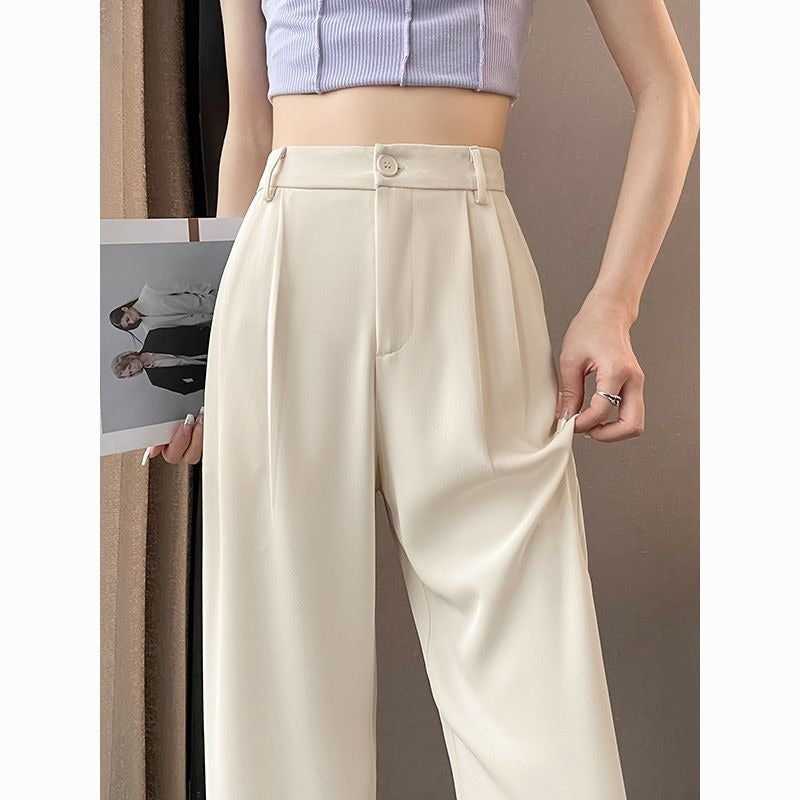 Elegant straight wide-leg trousers designed with a smooth draped effect that moves gracefully with every step. The high-waist cut enhances the waistline and creates a flattering long-leg silhouette, especially suitable for petite figures. Crafted with a lightweight, flowing fabric that offers comfort and structure, these trousers deliver a polished look without effort. The versatile minimalist design pairs seamlessly with blouses, shirts, or knit tops for daily wear or refined styling. A timeless essential that adds sophistication to any wardrobe.
