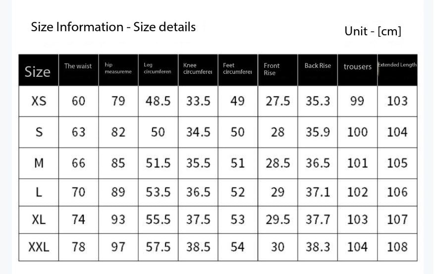 | Size | Waistline | Hips | Leg Circumference | Knee Circumference | Feet Circumference | Front Rise | Back Rise | Trouser | Extended Length |