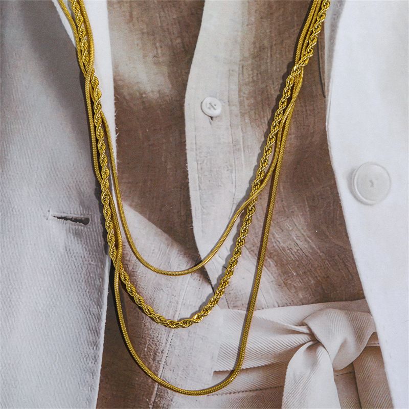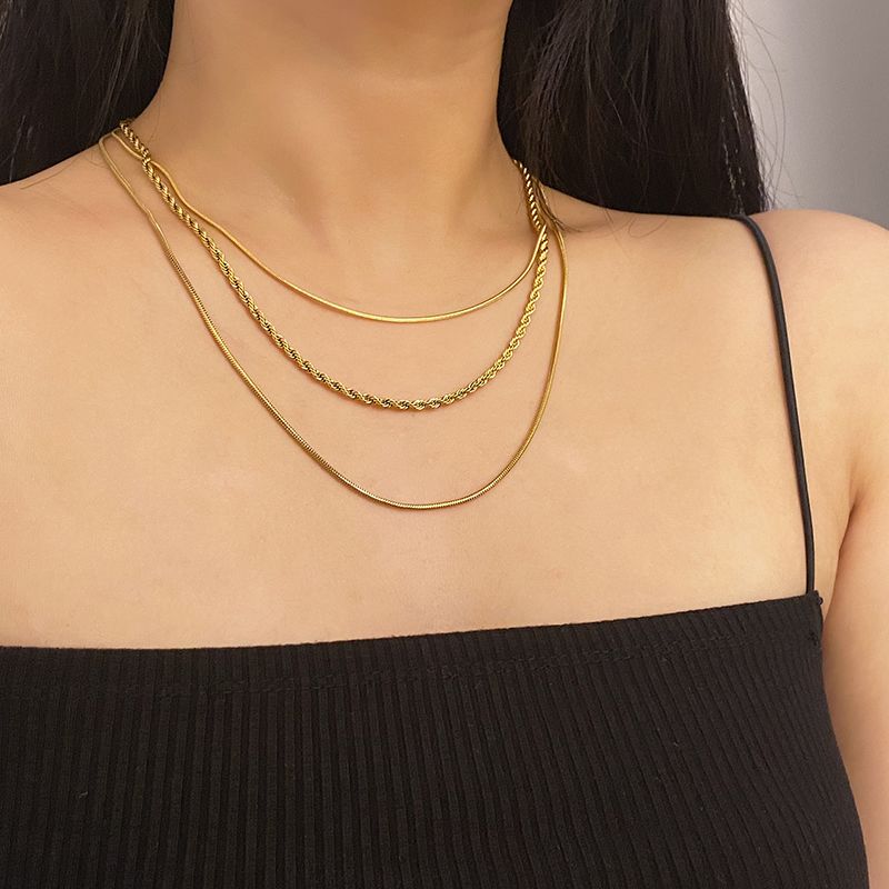 This layered necklace features a stylish combination of twisted chain and smooth snake bone design, creating depth and a modern statement look. Crafted from titanium steel, it offers durability with a polished finish that resists daily wear. The multi layer structure is designed for effortless stacking, sitting neatly along the collarbone for a clean yet fashionable silhouette. Minimal and versatile, it complements a wide range of outfits, making it an easy choice for everyday styling or elevated looks.