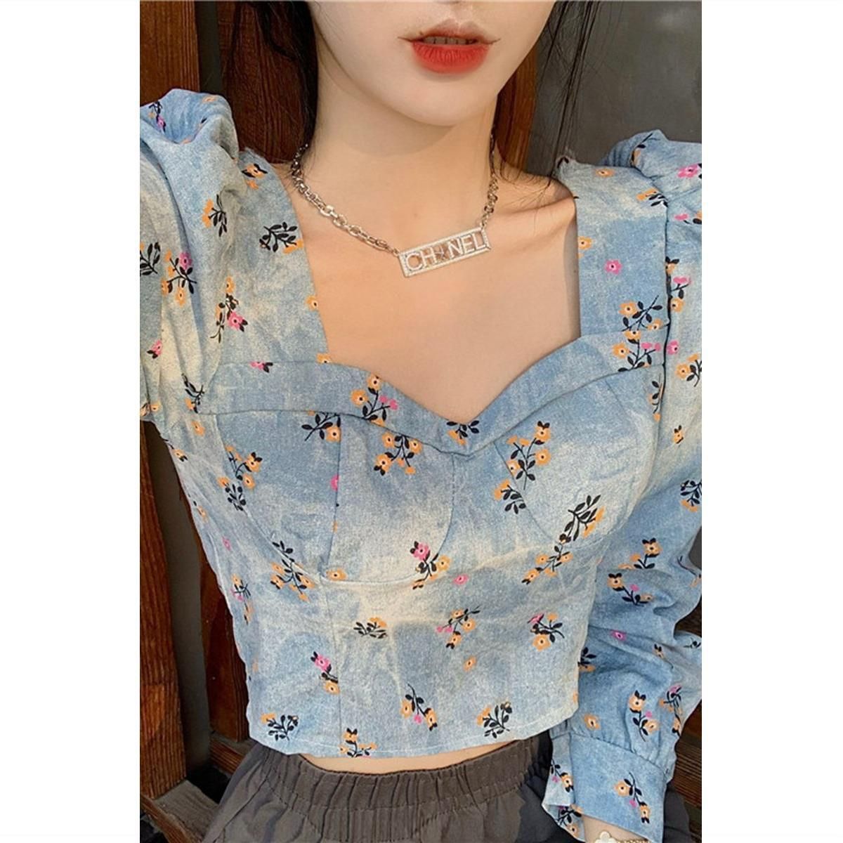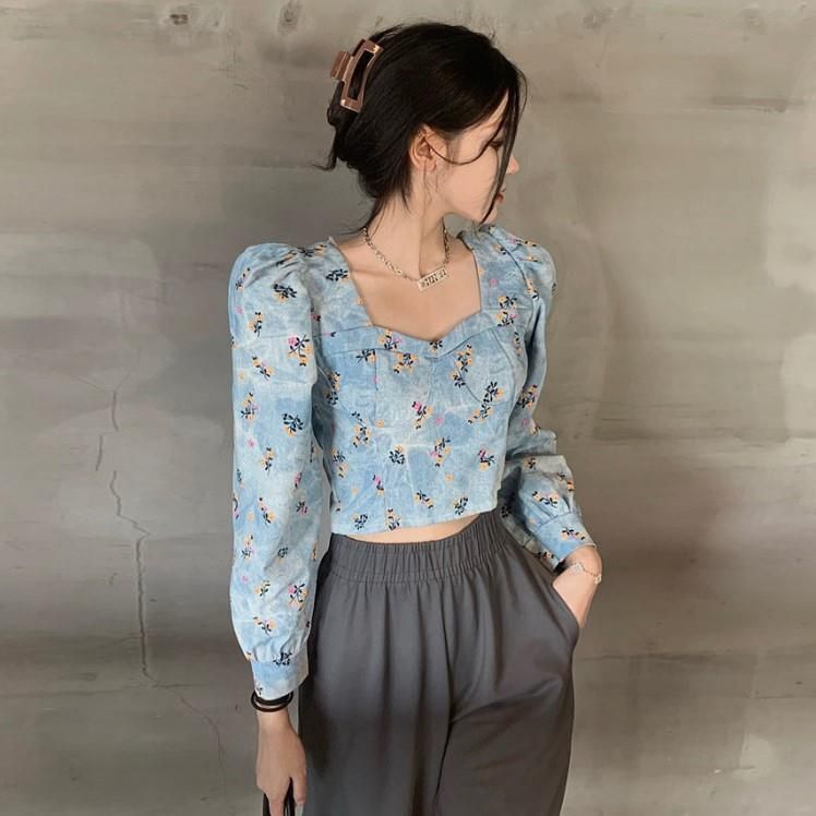 New Retro Printed Square Neck Short Shirt Top