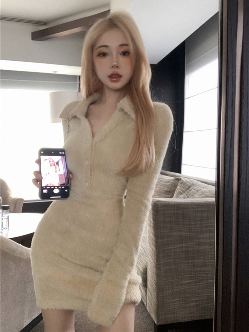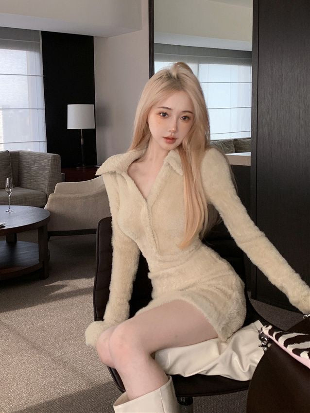 Plush Knitted Dress Hot Girl Long Sleeve Tight Inner Thickened Slim Fit Waist Covering Hip dress