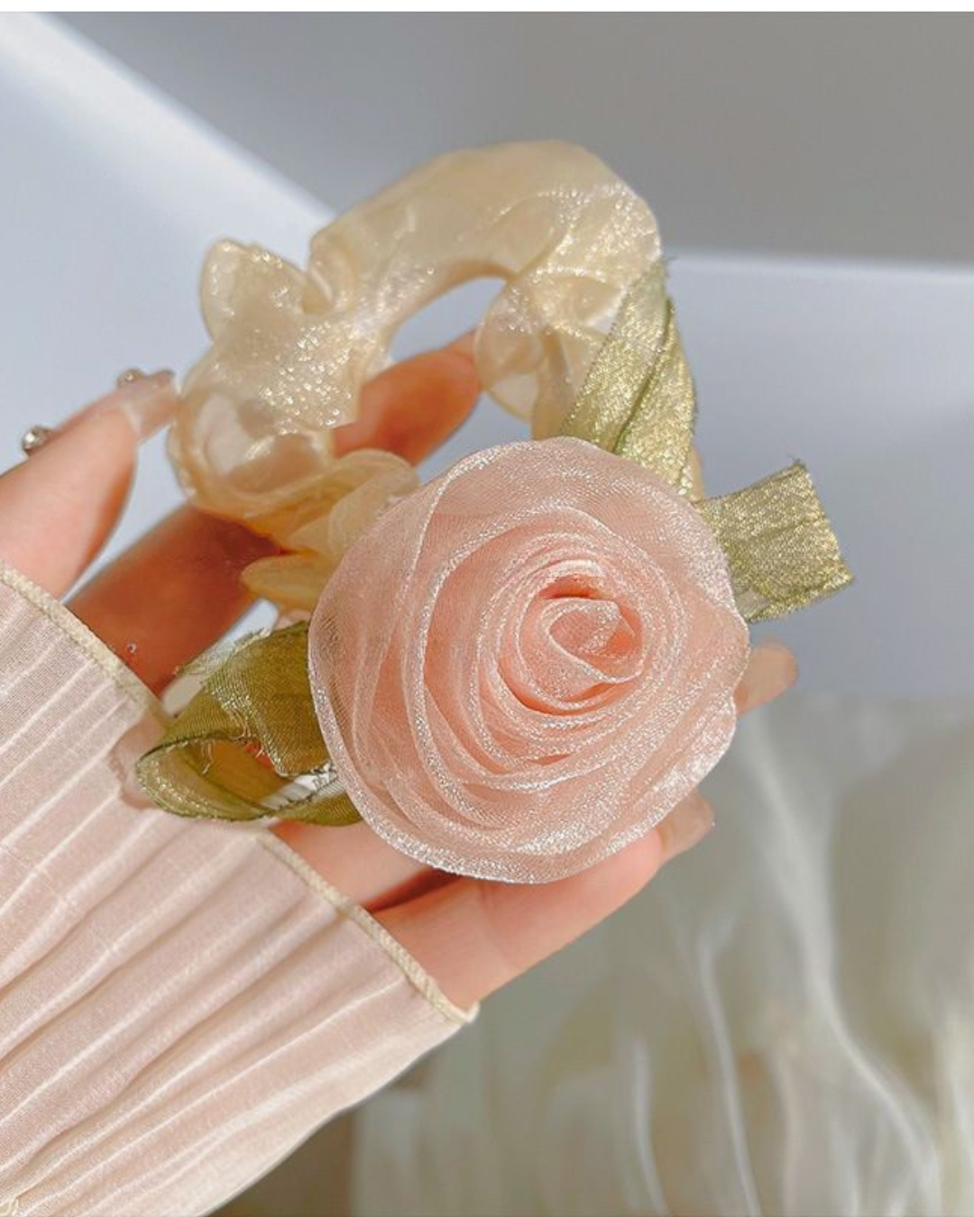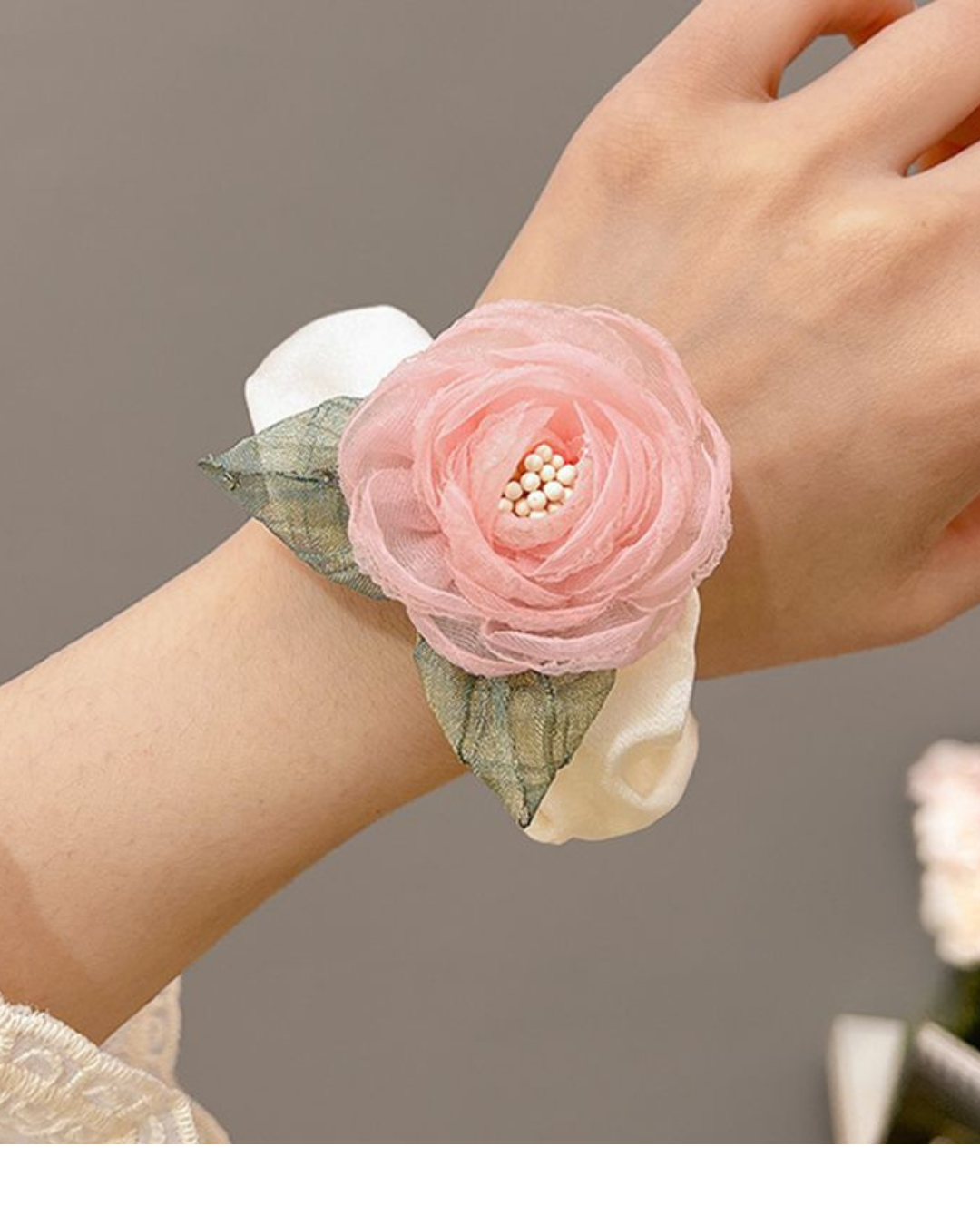 This delicate floral hair tie combines the beauty of roses and camellias in a soft, feminine design. Made with high-quality elastic material, it provides a secure yet comfortable hold for all hair types. The elegant fabric petals add a touch of charm to any hairstyle, making it perfect for daily wear or special occasions. Lightweight, durable, and designed to keep your hair neatly styled all day.