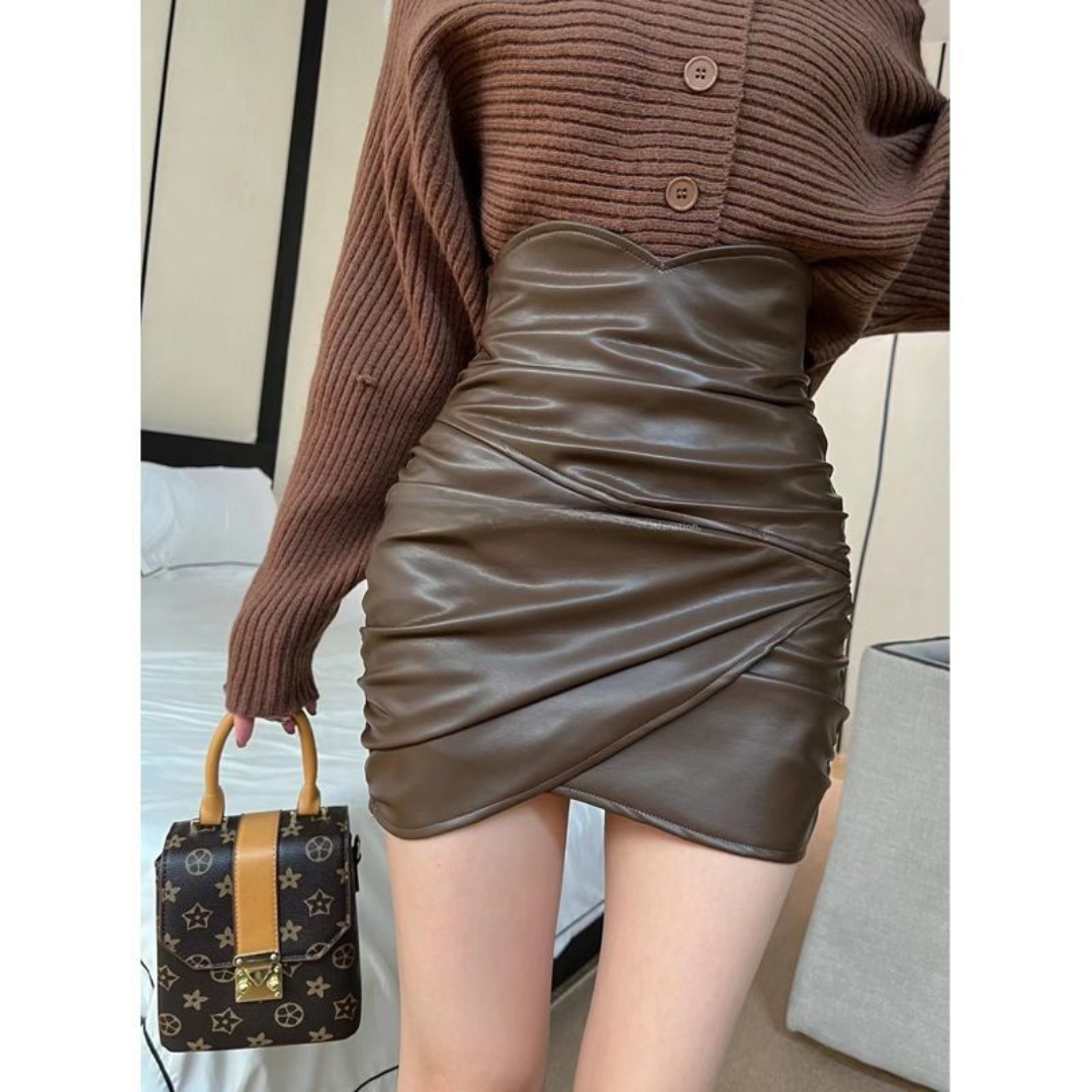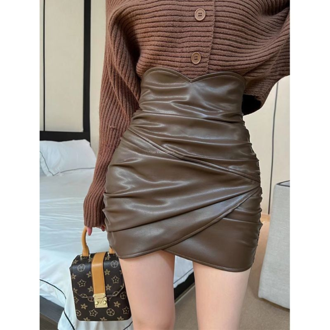 This ruched faux leather mini skirt combines edgy style with a flattering high-waist fit. The asymmetrical design enhances the silhouette, creating a bold and confident look. Perfect for a night out or casual chic styling, it adds a touch of Korean-inspired fashion to any wardrobe.