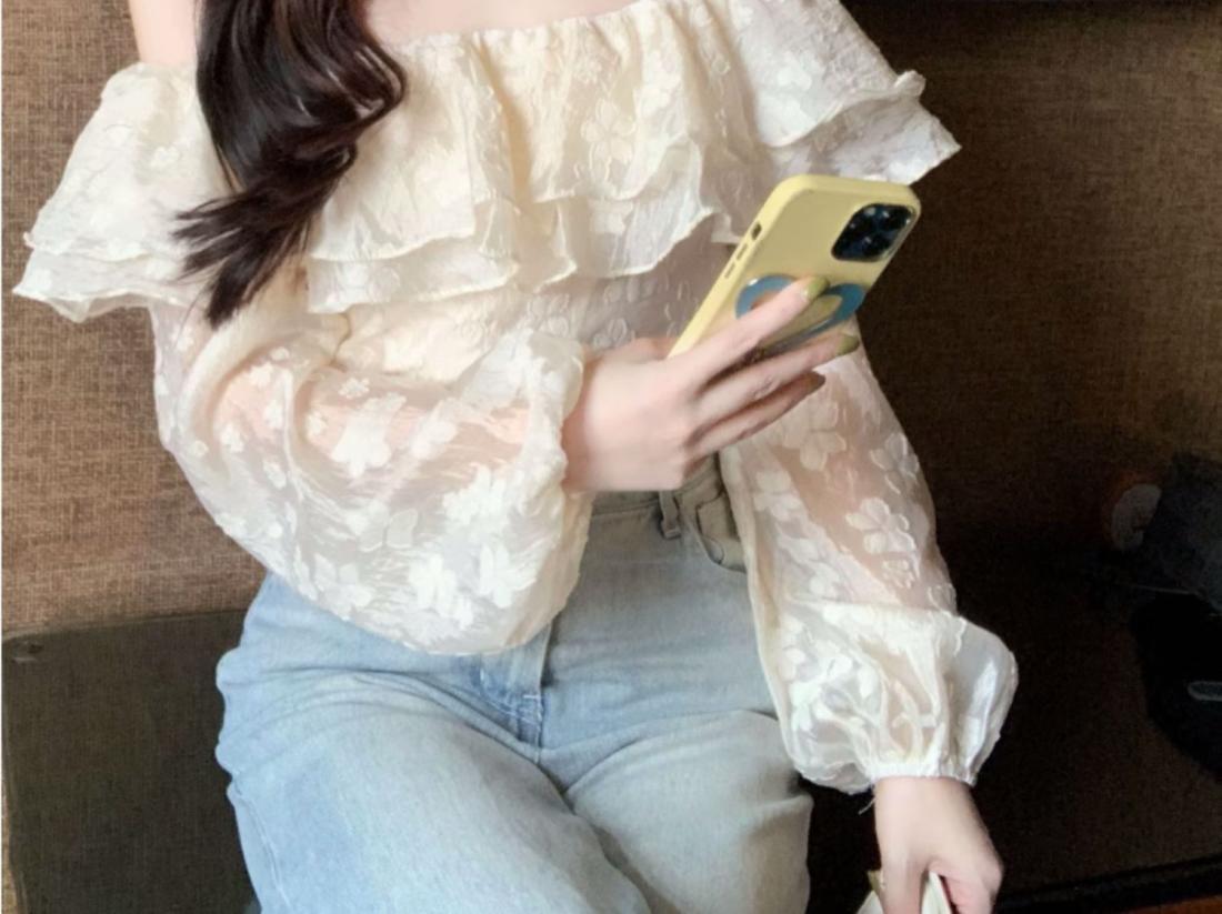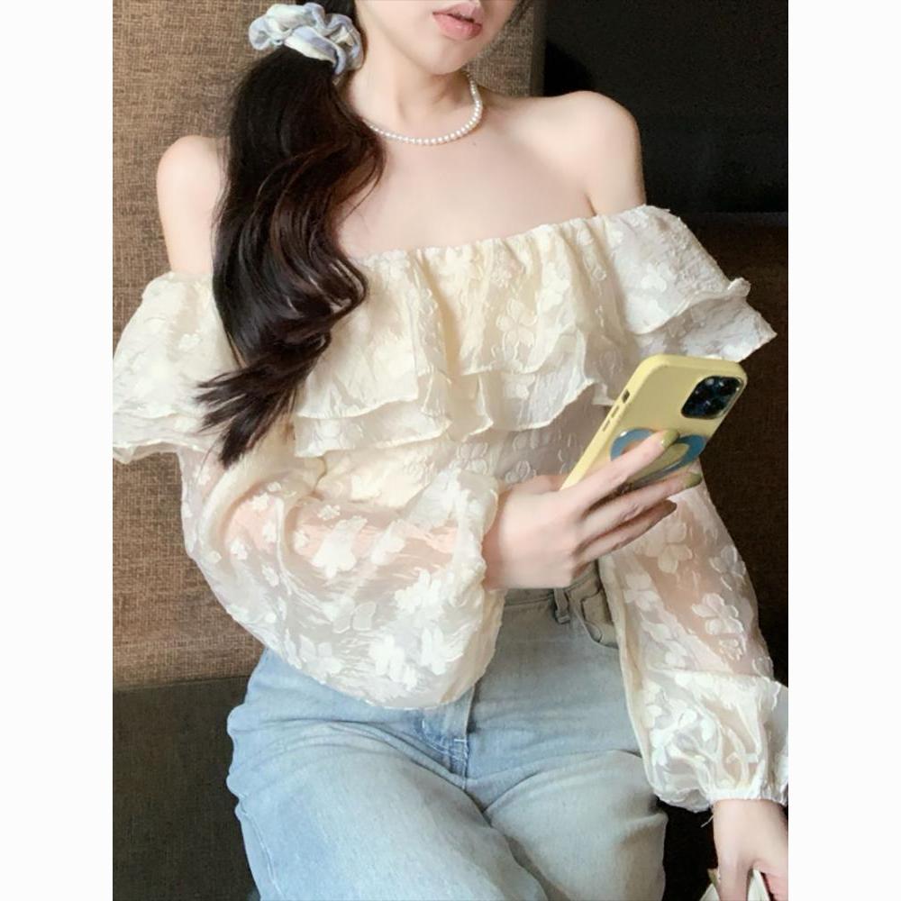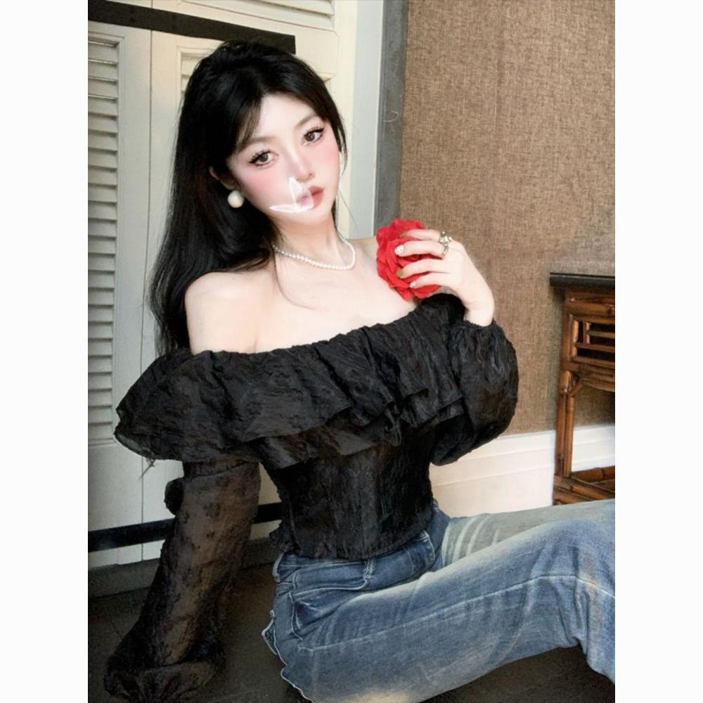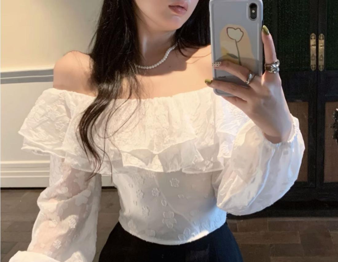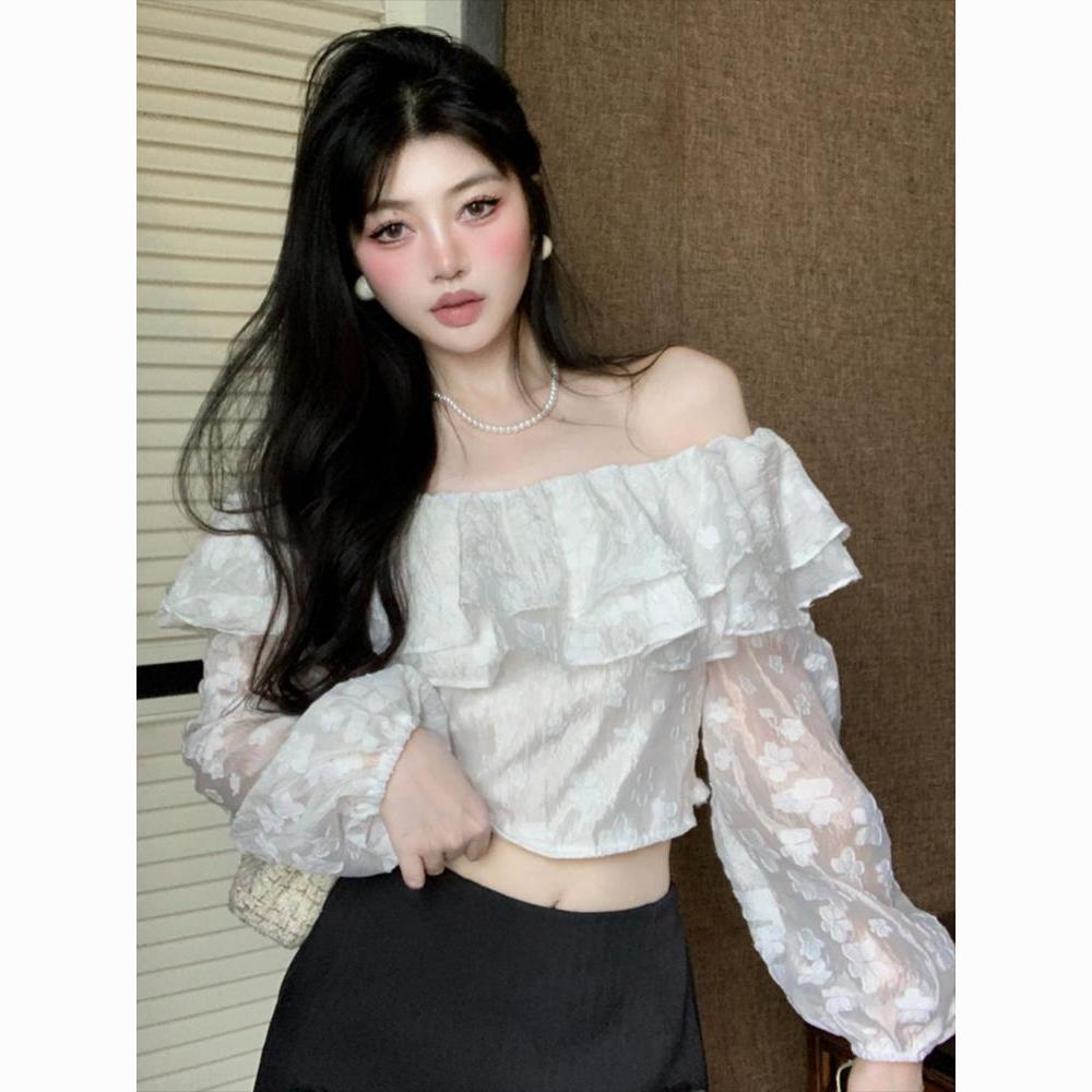 French Style Off-Shoulder Ruffled Lace Blouse – Sexy Summer Crop Top for WomenProduct Description (100 words):