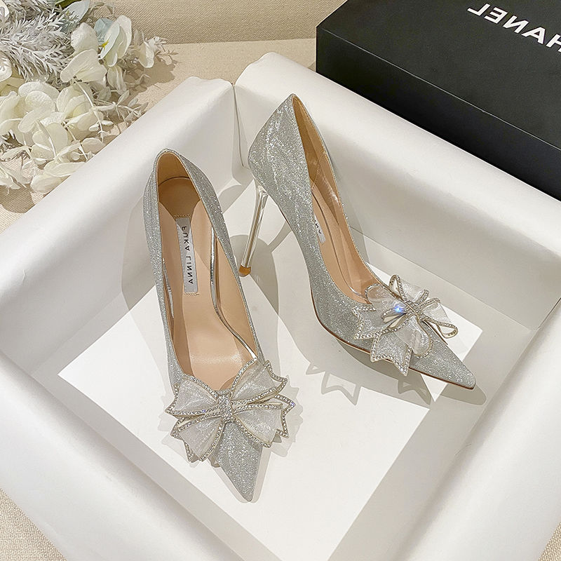 Step into elegance with these silver pointed-toe high heels, designed for weddings and special occasions. Adorned with a shimmering rhinestone bow, these shoes bring a touch of glamour and sophistication to your outfit. Perfect for the all seasons, their classic design pairs beautifully with dresses, making them ideal for brides, partygoers, or anyone looking to shine. The comfortable fit and graceful silhouette ensure you’ll look stunning while feeling at ease throughout the event.
