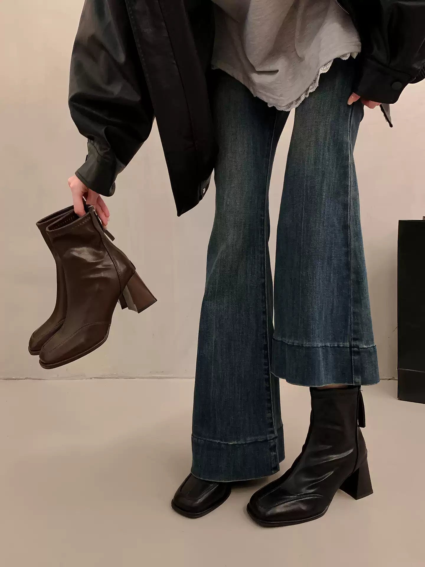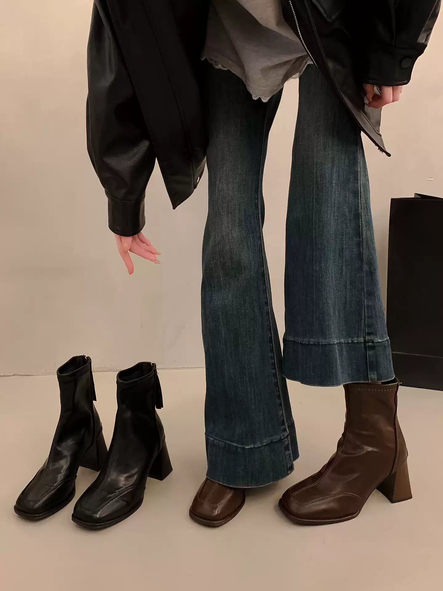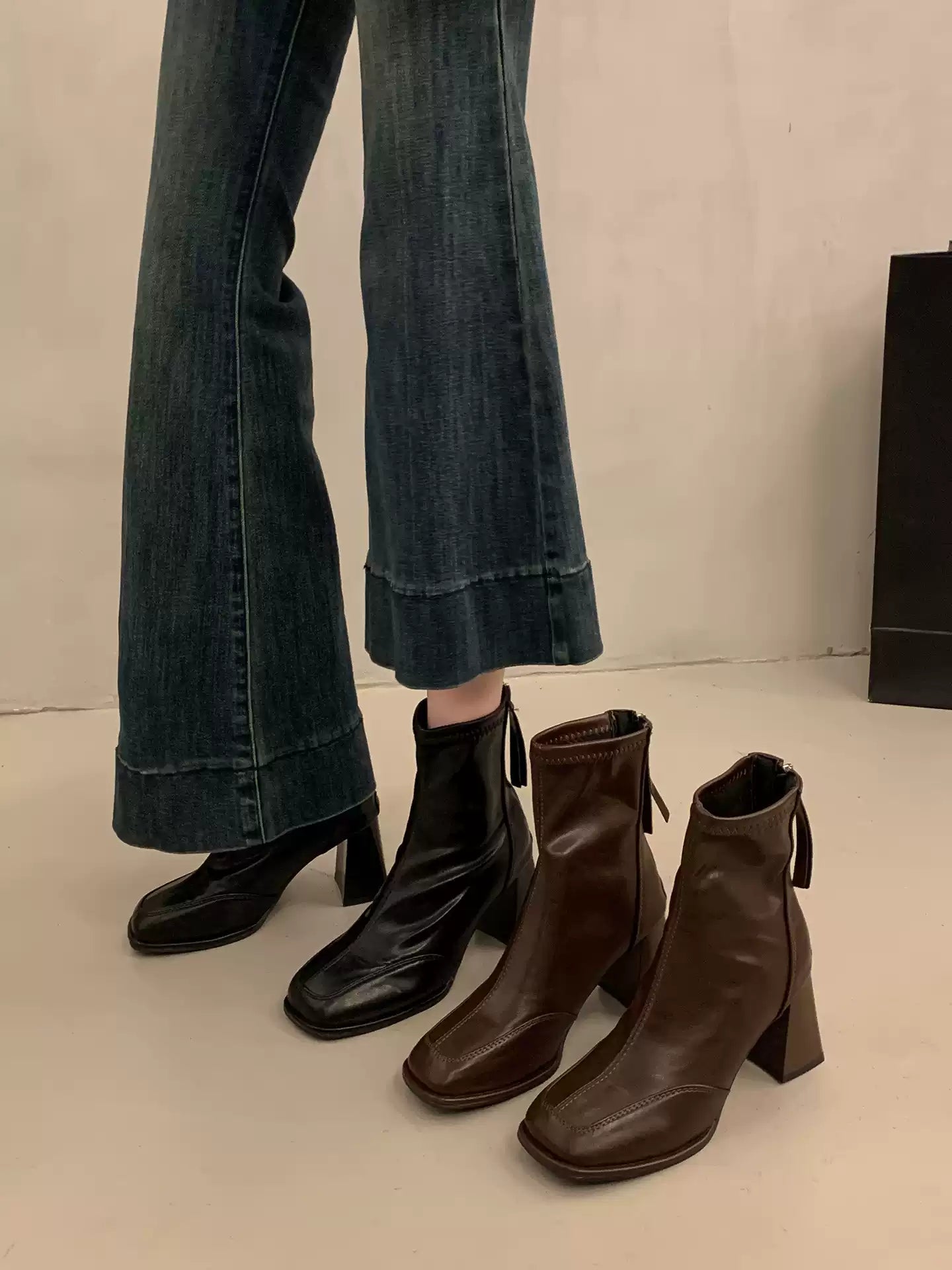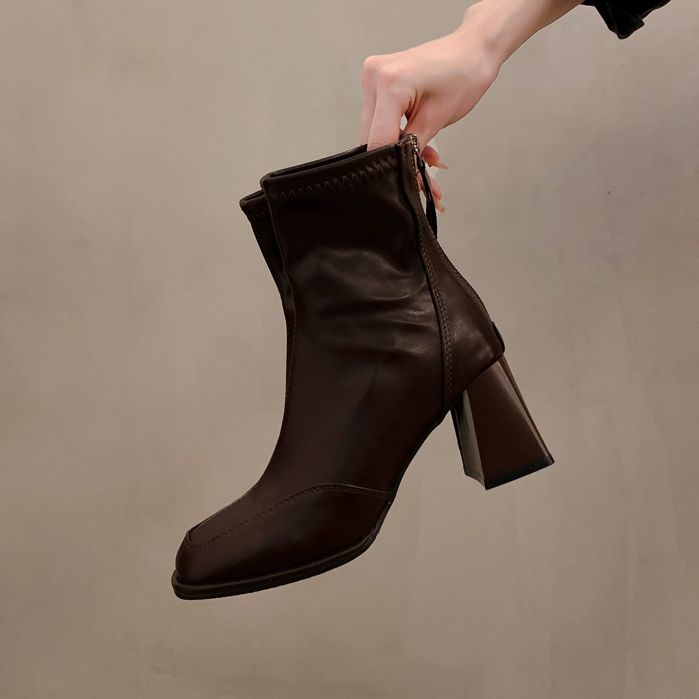These elegant square toe ankle boots feature a sleek stretch-fit design that flatters the leg line. The soft, flexible material offers comfort while maintaining a refined silhouette. A convenient back zipper ensures easy wear, and the chunky high heel adds height with stability. Perfect for pairing with dresses, skirts, or slim pants, these boots bring effortless French elegance to any outfit.