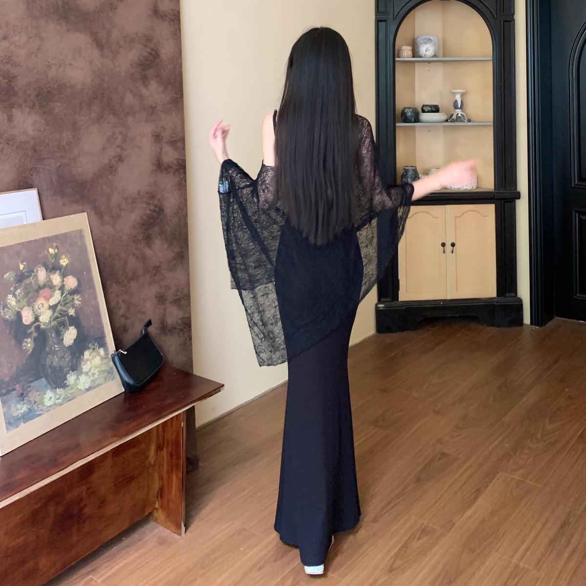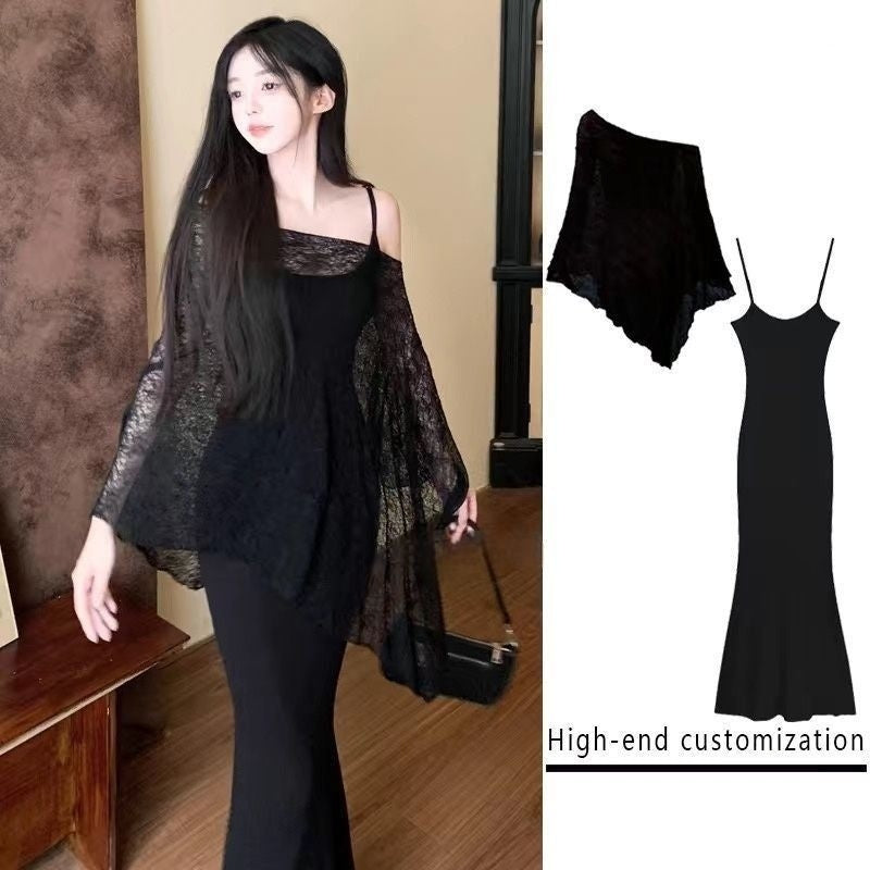 Sweet Spicy Spaghetti Strap Fishtail Dress Set with Lightweight Shawl