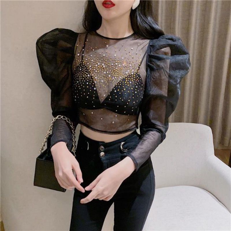 Transparent Mesh Top with Rhinestones – Sweet & Stylish Outfit